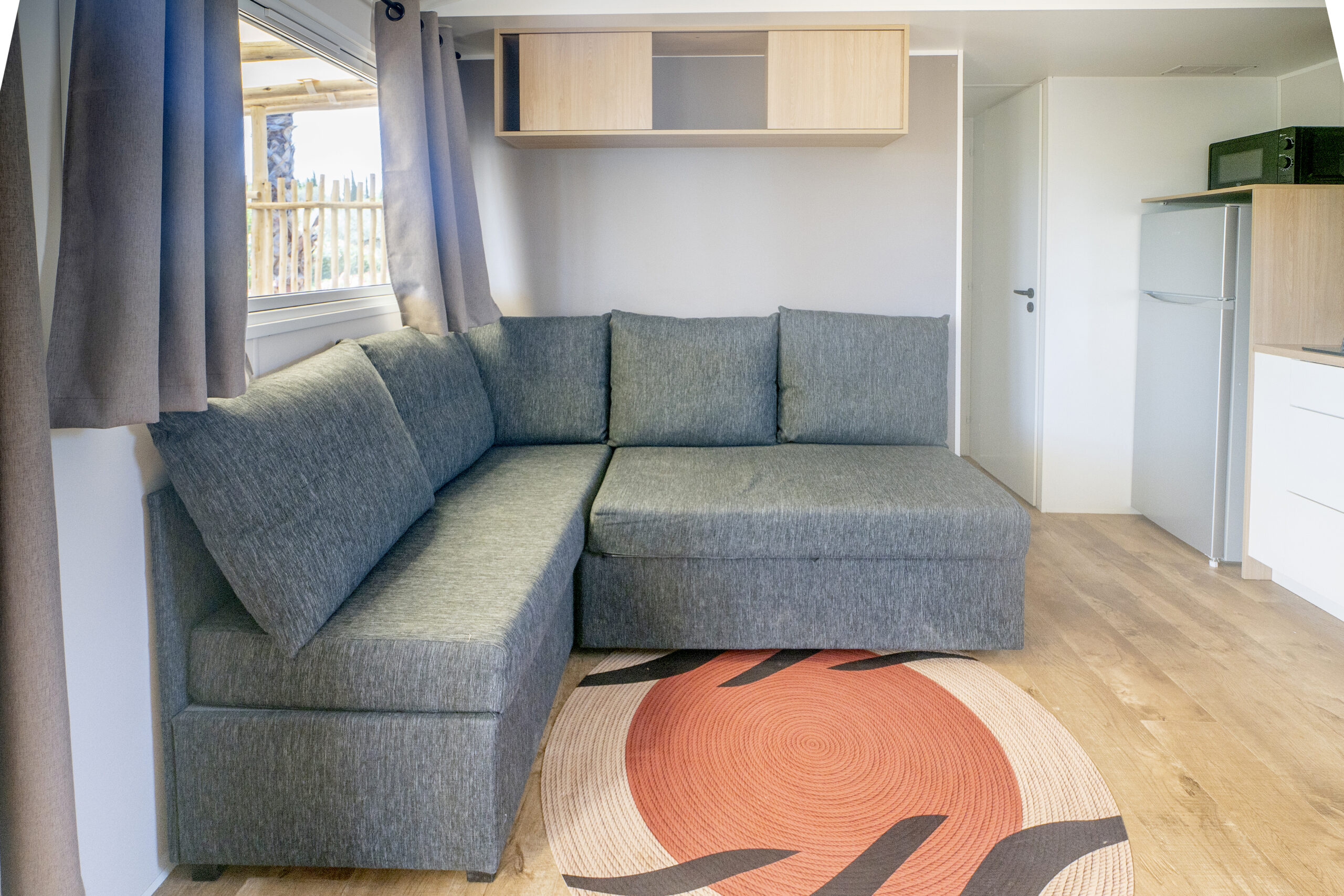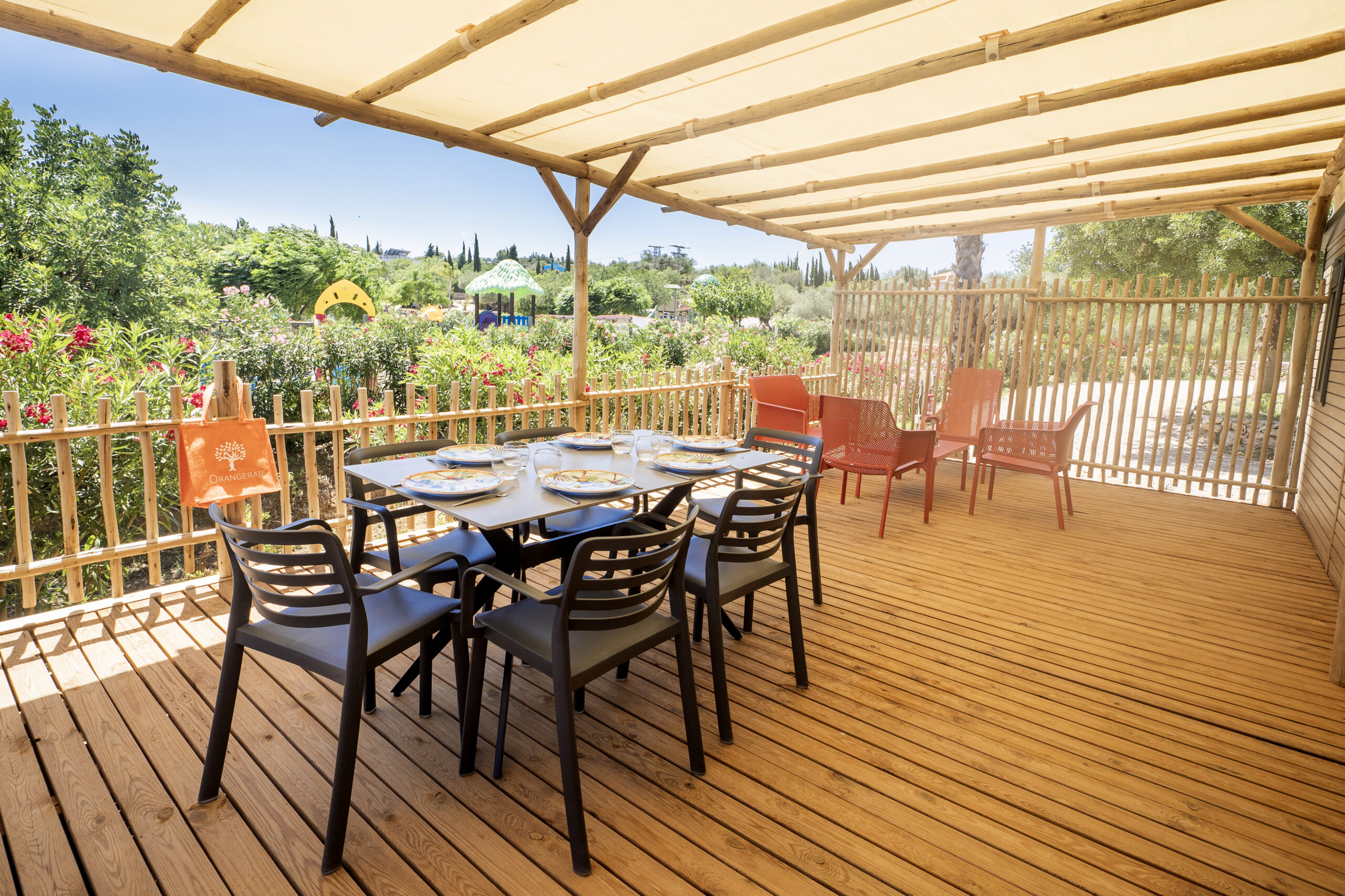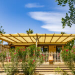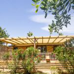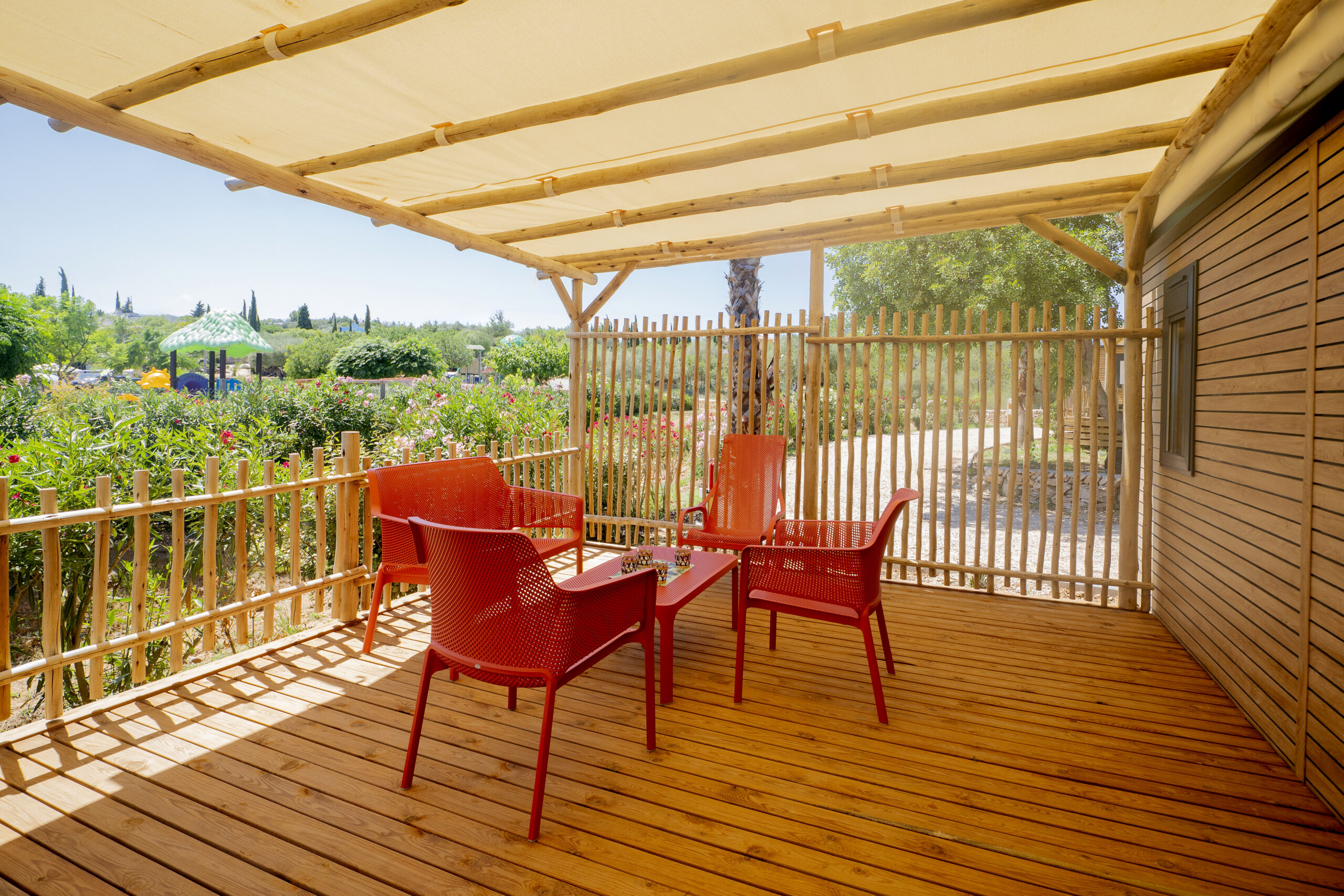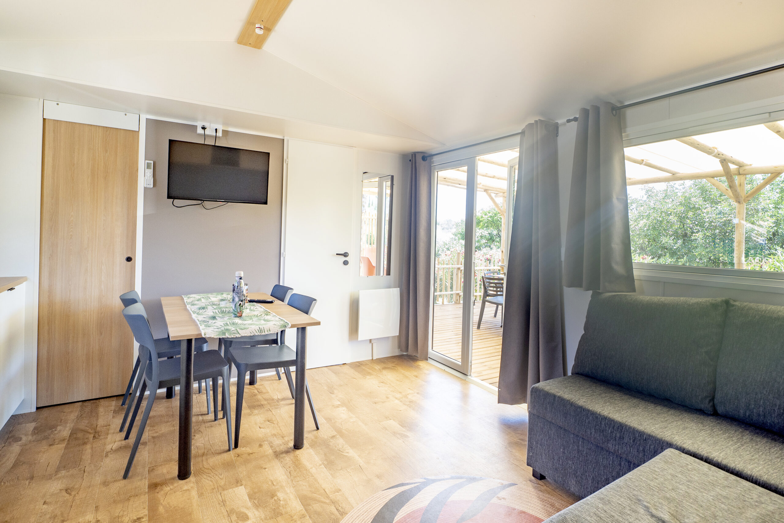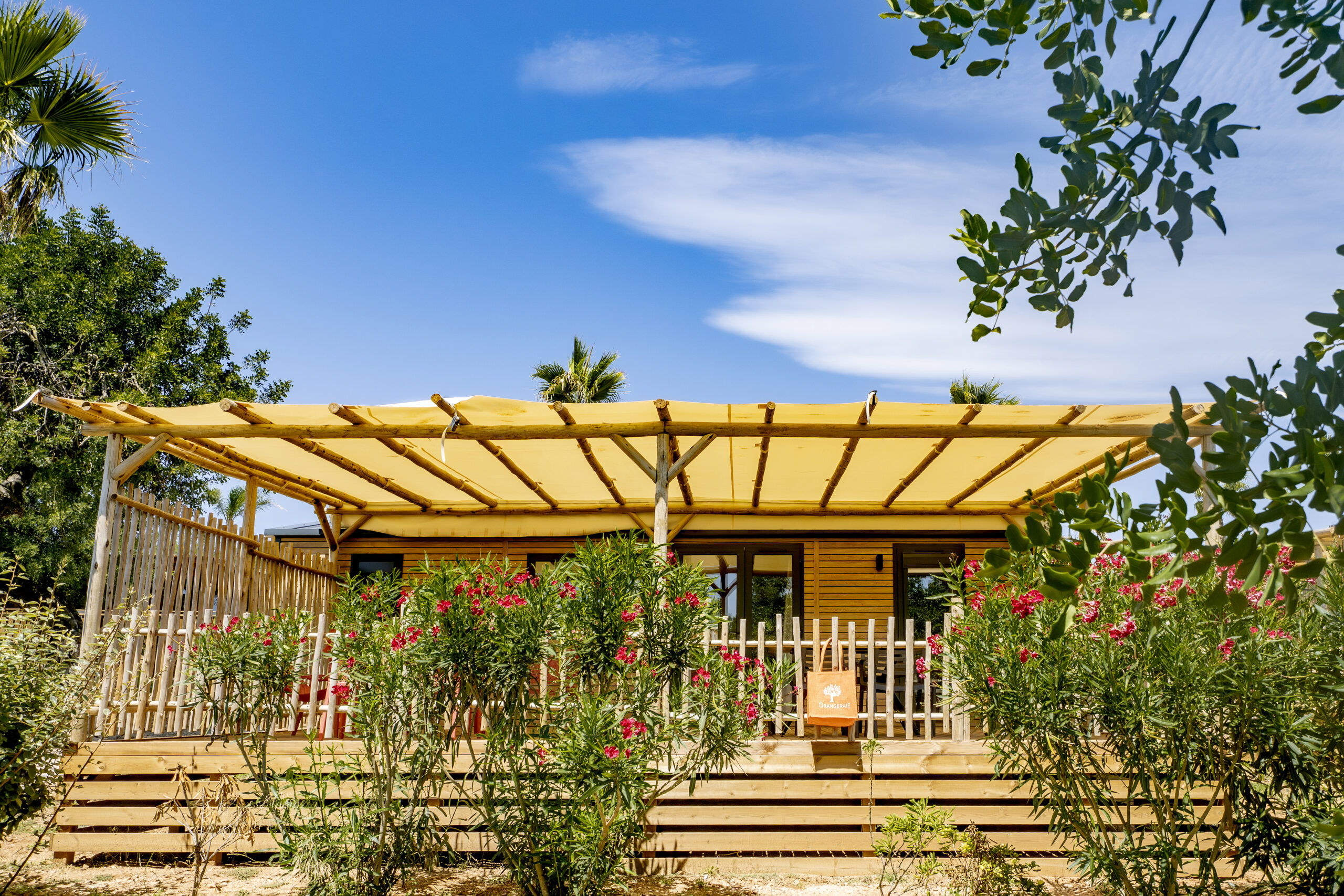 Our Sol chalet villas, made entirely of fir wood, are a top-of-the-range habitat linked to the quality of the construction. The thickness of the wood insulation is a guarantee for both hot and cool periods (which does not exclude air conditioning). With 35 M2 of living space, you enjoy a spacious interior. The large covered terrace is a room of its own to enjoy the mild climate.