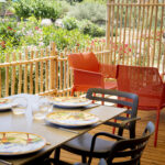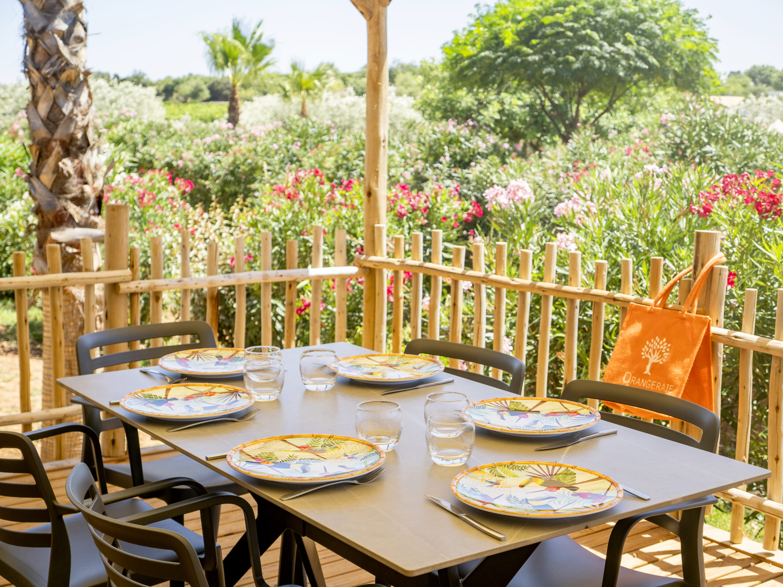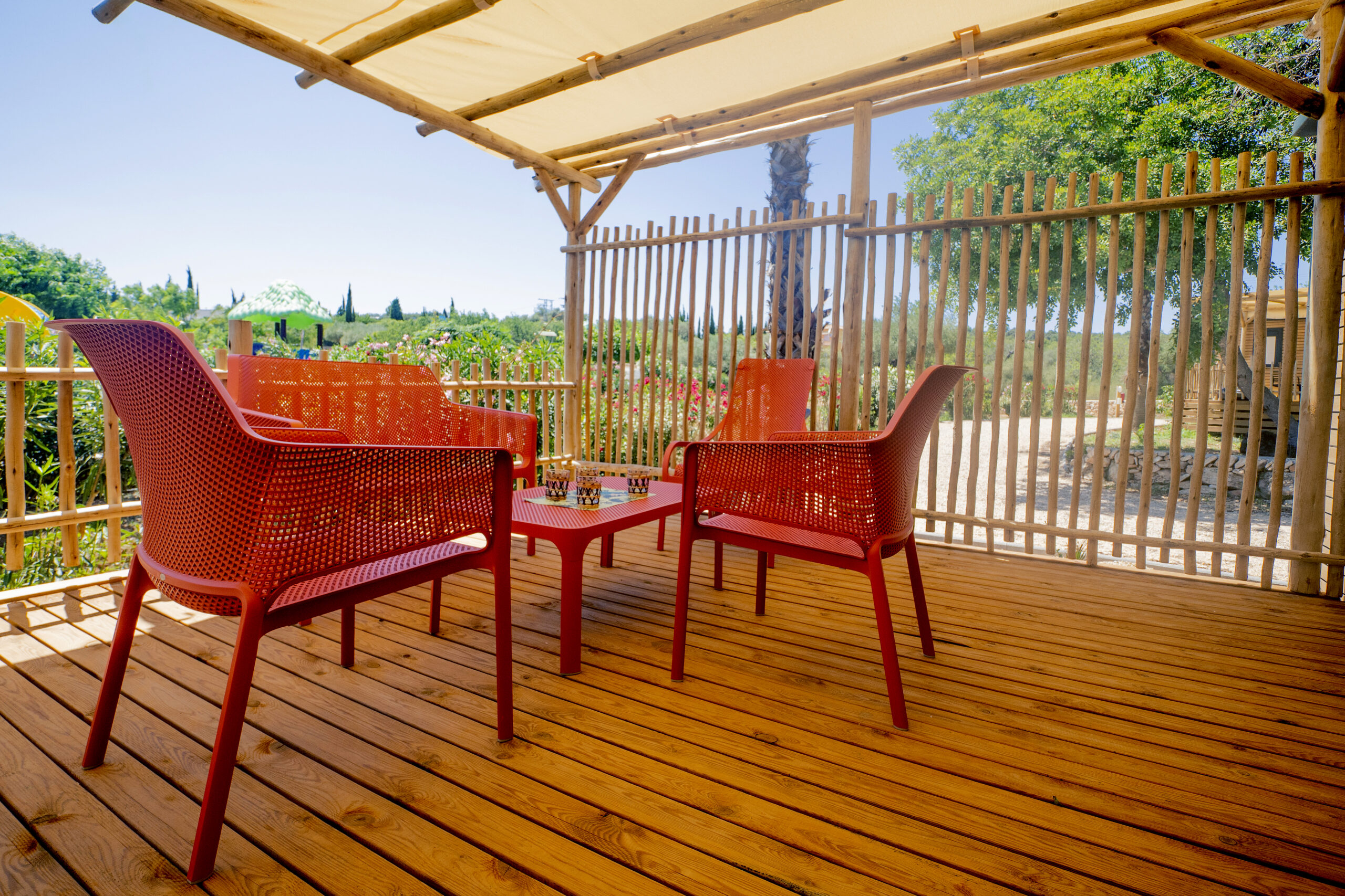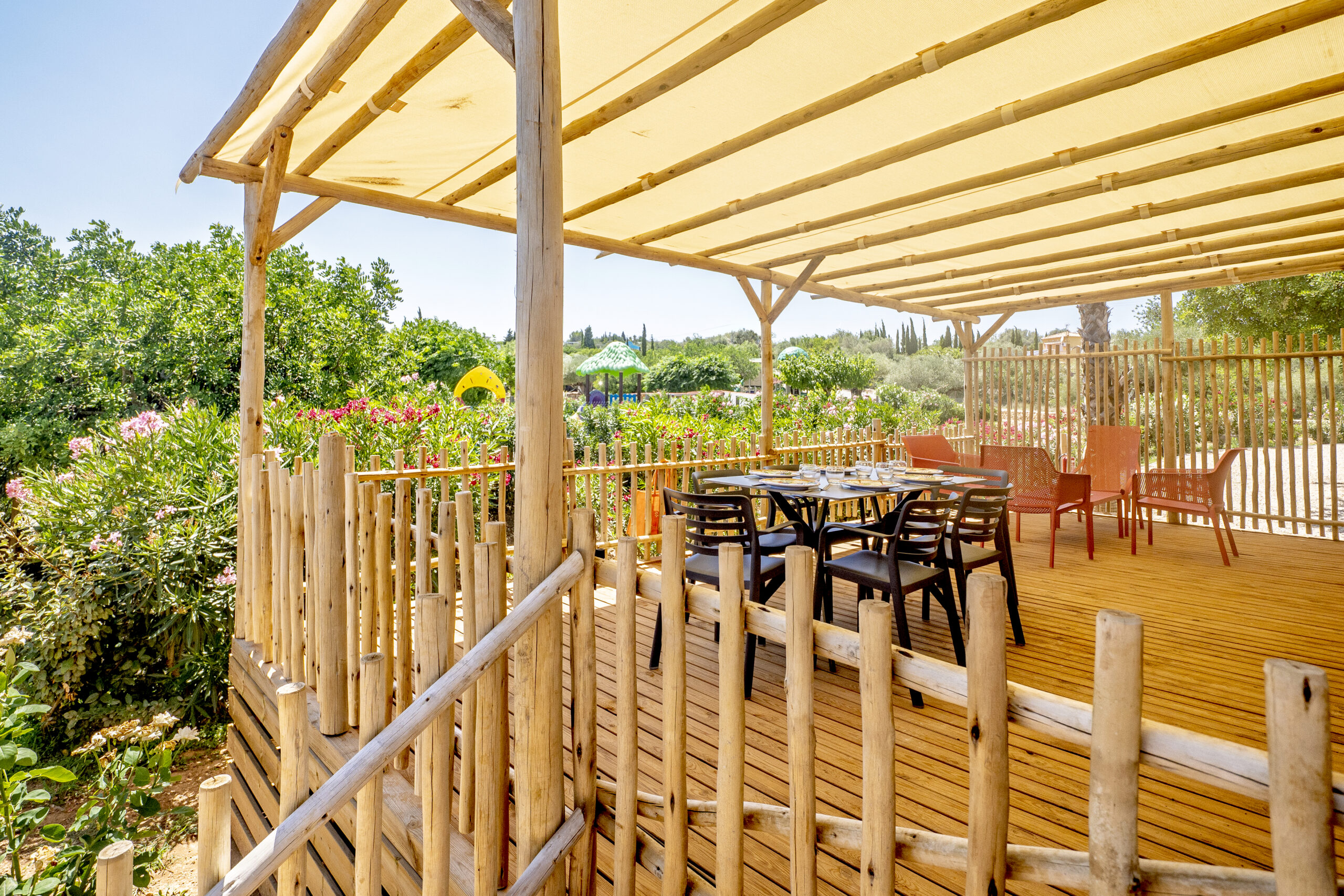 Unusual habitat also, our lodges (3) will plunge you into an African atmosphere. Very large, more than 40M2, they offer you an exceptional space for 5 people, and you have a panoramic terrace, large, in direct relation with the kitchen in order to favour aperitifs or tapas evenings. The tent, very thick, insulates well and you have the air conditioning.