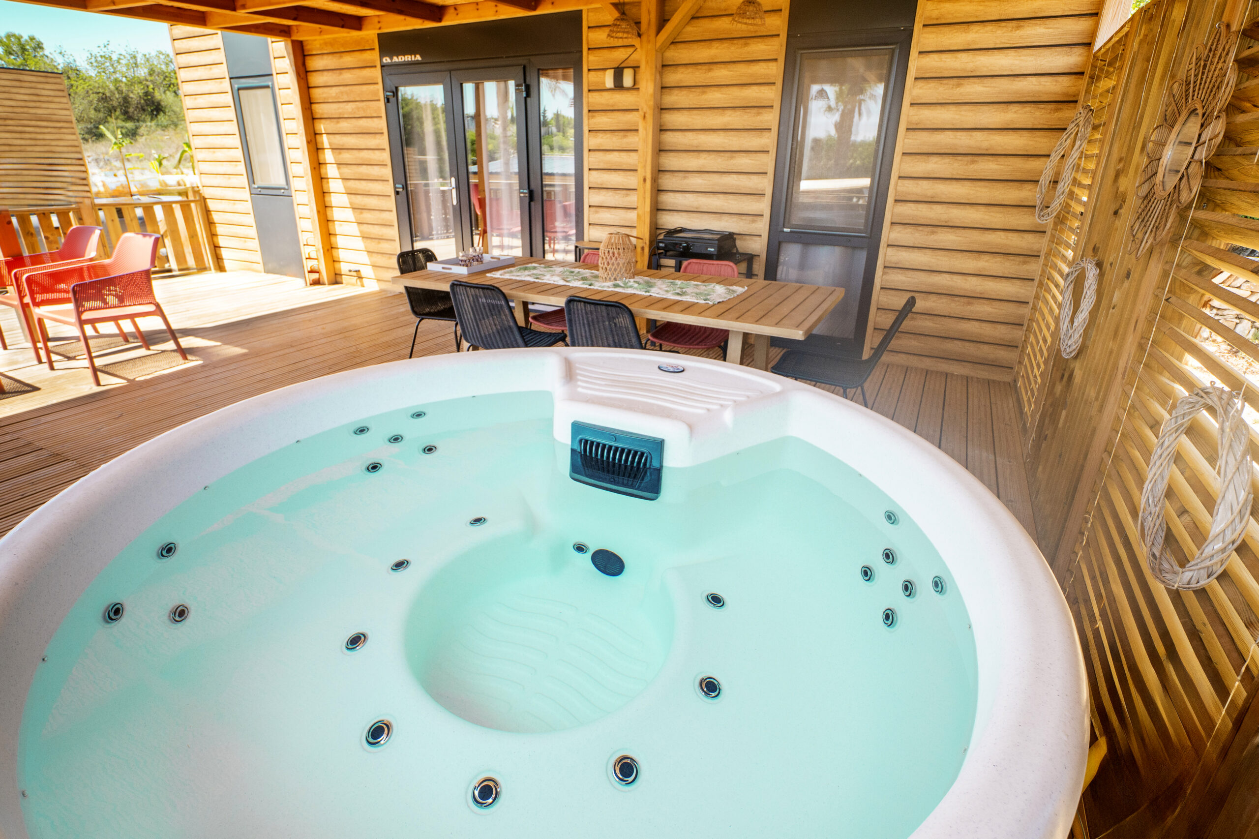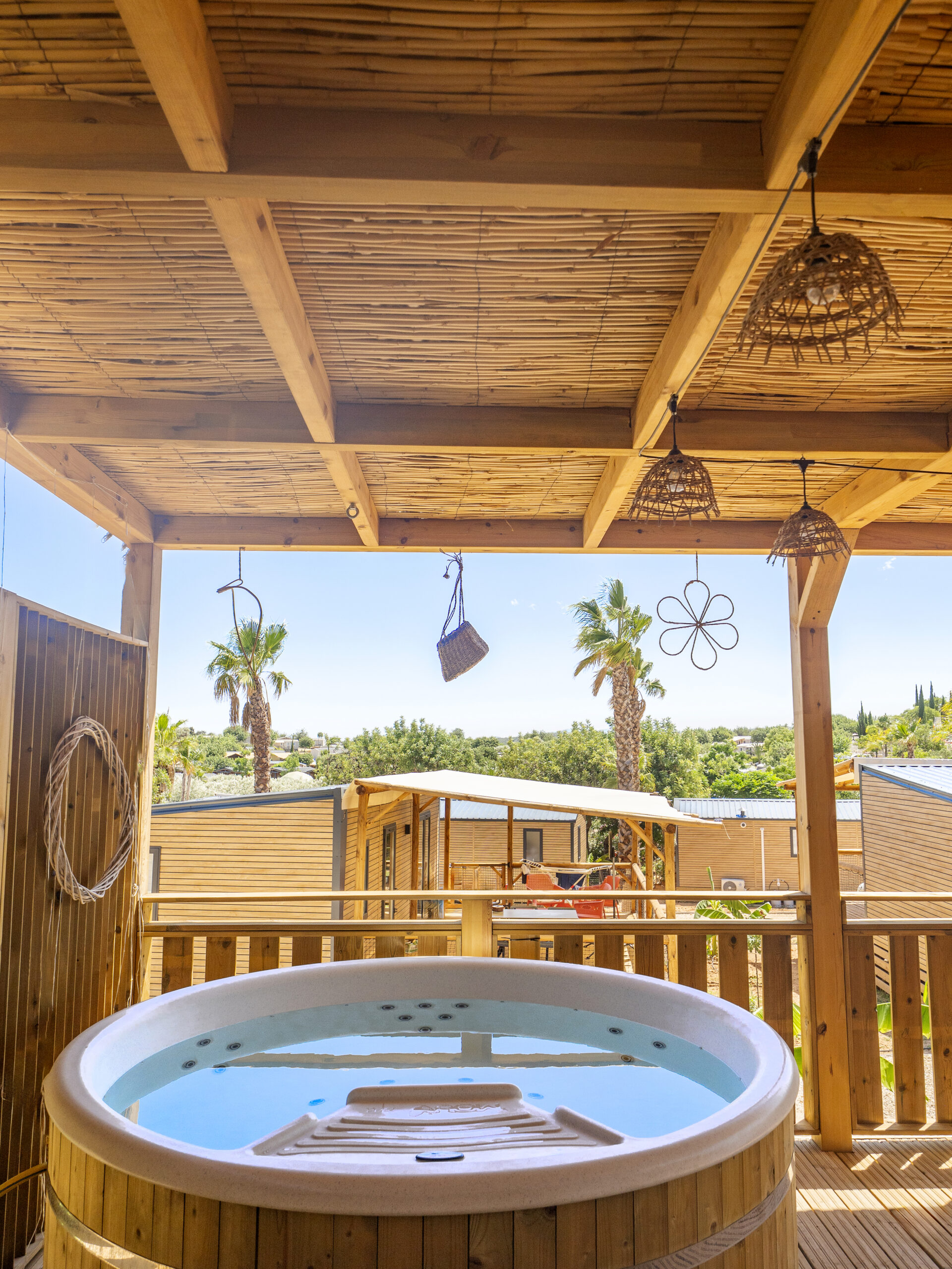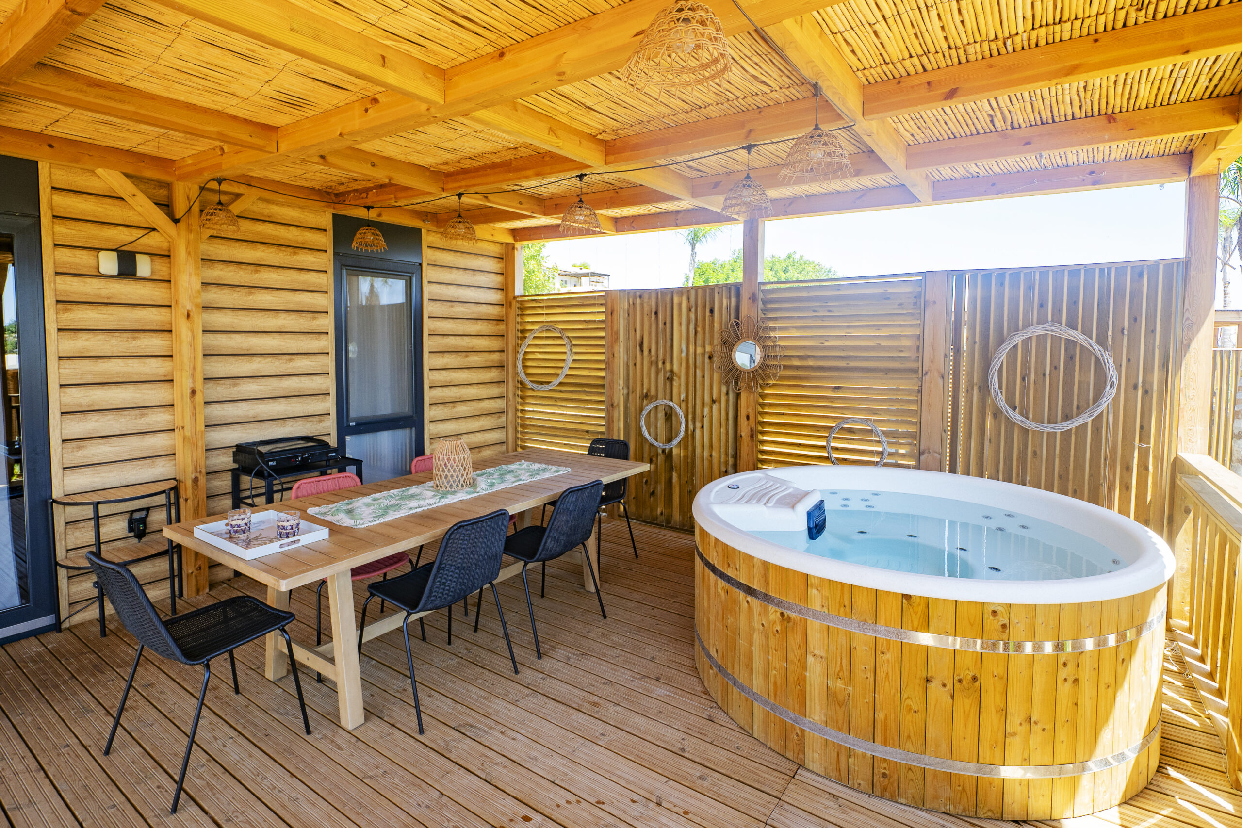 Our large chalets, such as the Domo, are the campsite’s premium accommodation. Like the Sol chalets, their isolation is top notch. Vast of 55M2, they can accommodate large families. We have 2 Duplexes, and 1 large full floor chalet. They are all equipped with a spa on the covered terrace to offer you maximum relaxation.